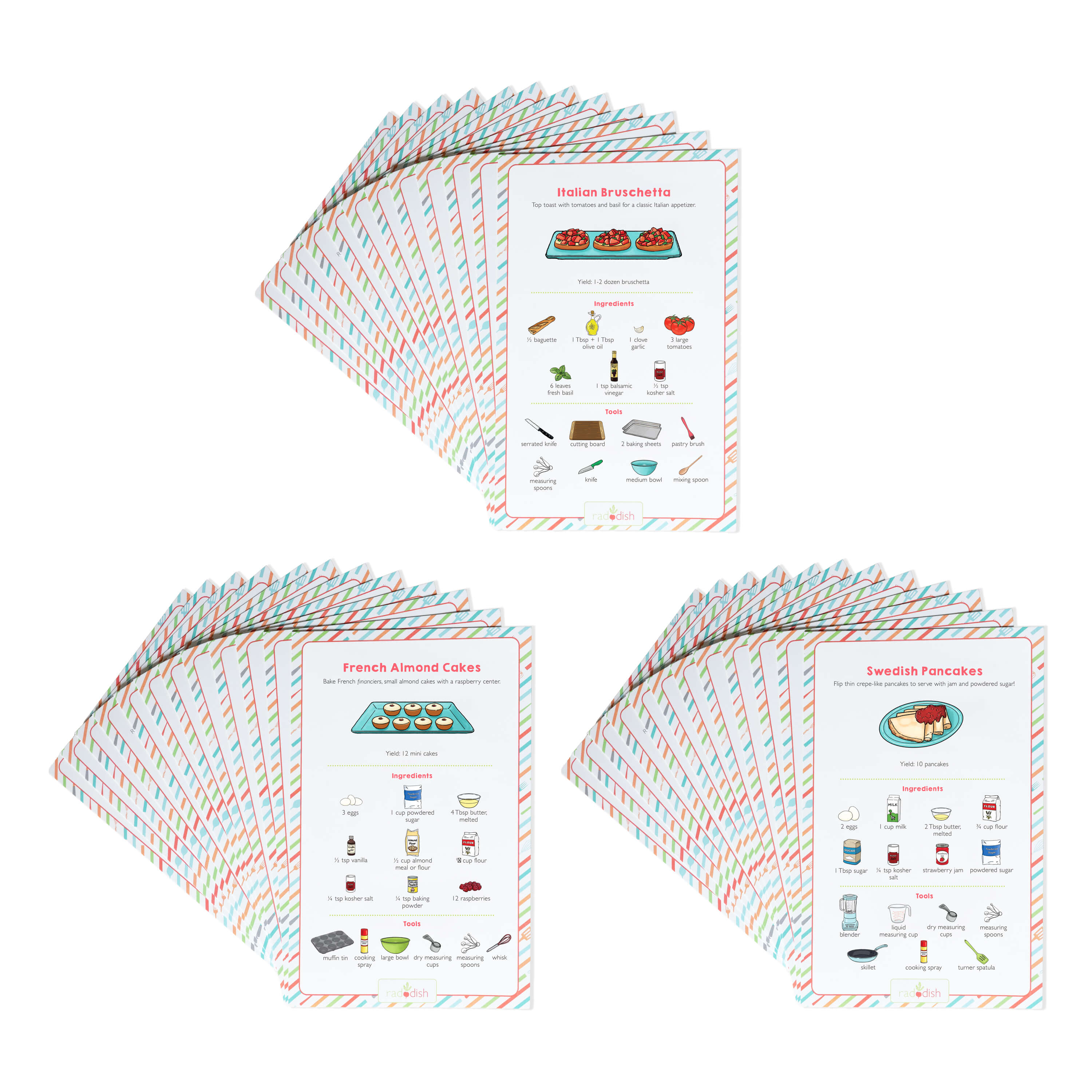 Recipe Starter Pack Bundle is the perfect way to get started cooking immediately with simple 4-6 step recipes! Bundle includes all three recipe starter packs. Each pack contains 12 laminated 5x7 recipe cards that are sized to fit in a Create-A-Cookbook binder.