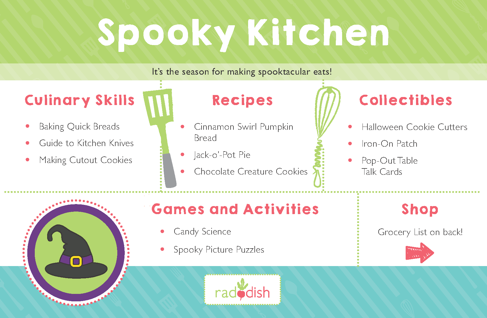Spooky Kitchen stirs up culinary creativity with festive twists on food. Serve pumpkin bread with a swirl of sweet cinnamon, and transform pot pie into a jack-o’-lantern. Make scary good cookies, and conduct candy experiments!