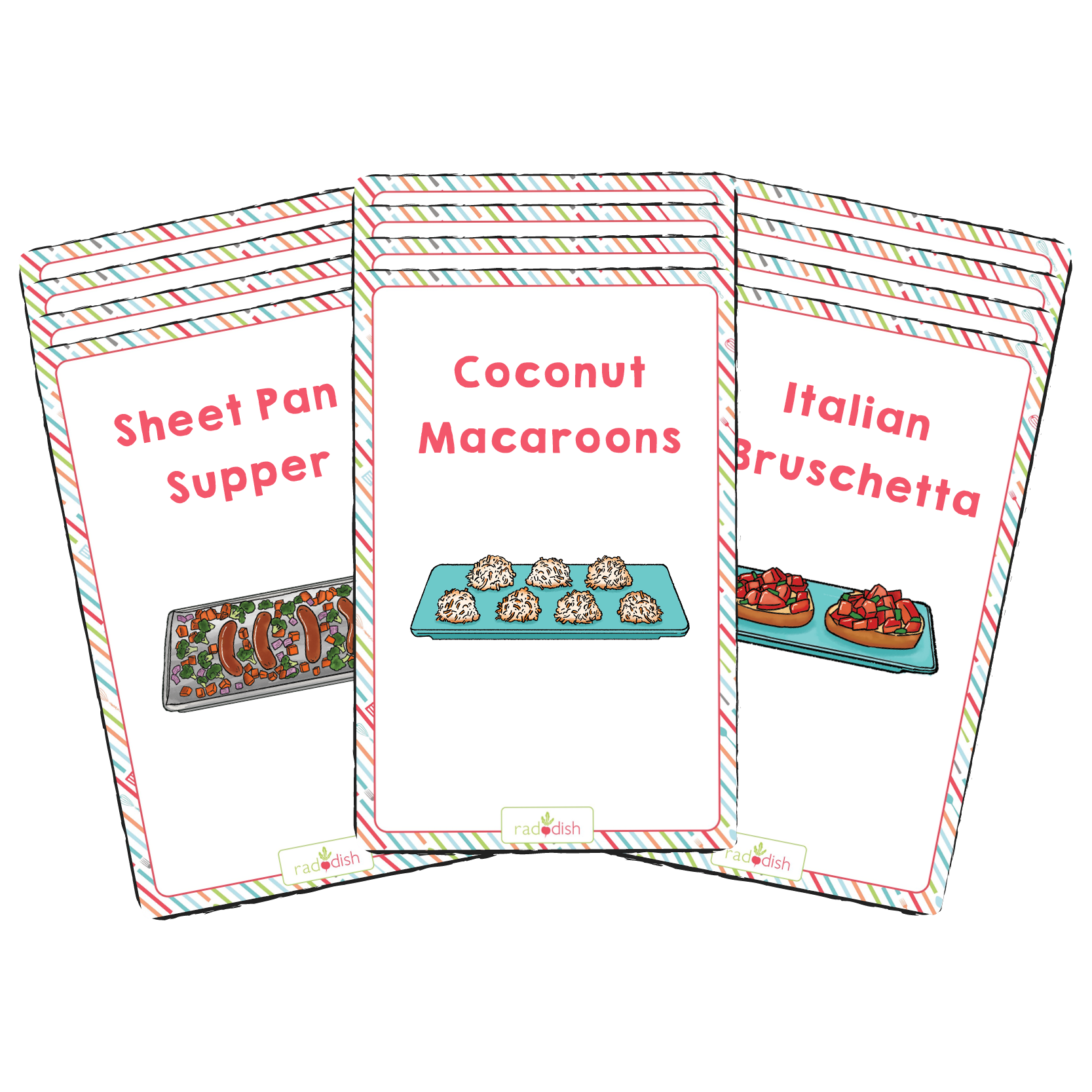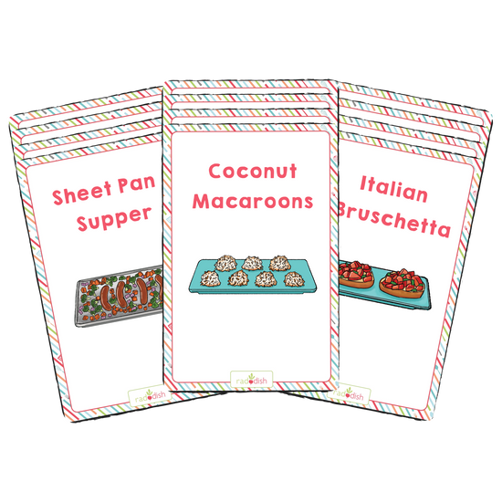 Recipe Starter Packs feature 12 laminated, easy-to-follow recipes designed to fit right into your cookbook binder. Each recipe takes just 4–6 steps, making it simple for young chefs to prepare favorite snacks and sweets. It’s a fun way to keep cooking all month long while you wait for your next kit to arrive!